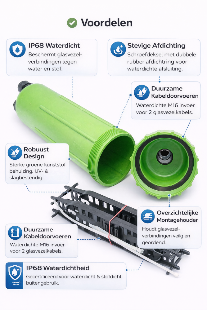In situaties waarin het noodzakelijk is om een glasvezel verbinding af te dichten, een glasvezel kabel buiten te beschermen of een waterdichte glasvezel behuizing toe te passen, vormt dit product een functionele en technisch onderbouwde keuze.