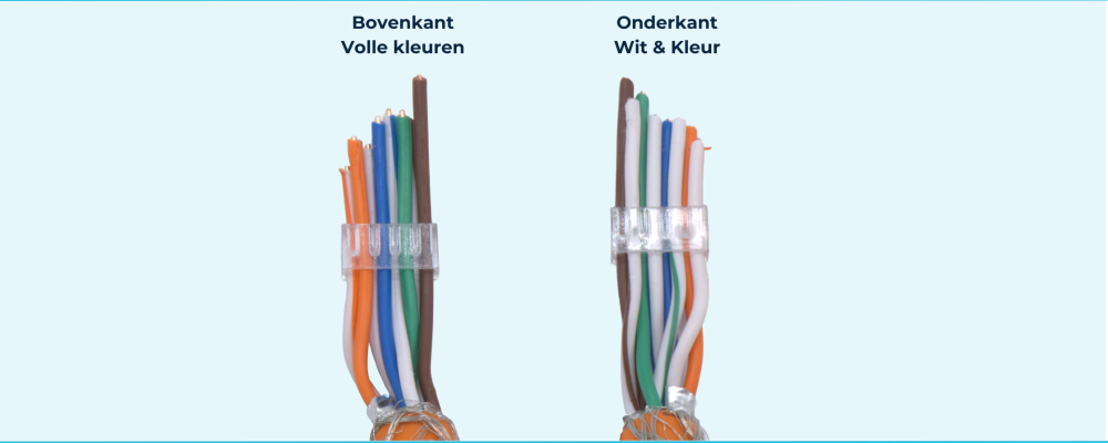De aders van de kabel worden volgens het kleurenschema in het transparante inzetstuk geplaatst. De volle kleuren komen aan de bovenkant, de witte combinaties aan de onderkant. Dit zorgt voor een nette uitlijning en voorkomt fouten bij het aansluiten.