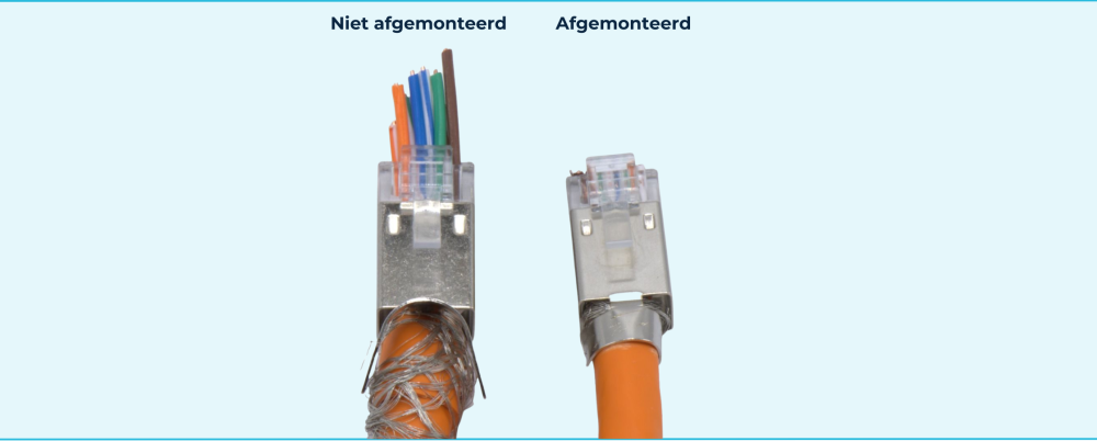 Het inzetstuk met de aders wordt in de RJ45 Cat6A/Cat7-plug geschoven. Let op: het inzetstuk kan maar op één manier worden geplaatst, zodat de aders exact aansluiten op de juiste contacten. De aders maken vervolgens contact met de gouden pinnen, terwijl de kabelmantel en afscherming goed aansluiten in het metalen huis. Zo ontstaat een stabiele verbinding met minimale signaalverliezen.